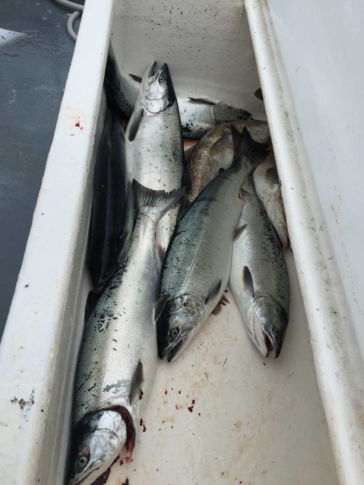 We are limited to 2 halibuts per day, per person. So among the four of us, we caught 8 halibuts. As a bonus, we caught a silver salmon, aka Coho and a cod.